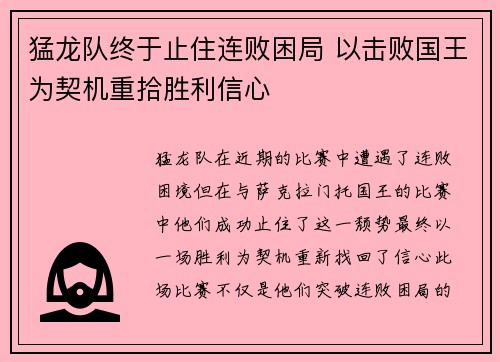 猛龙队在近期的比赛中遭遇了连败困境,但在与萨克拉门托国王的比赛中,他们成功止住了这一颓势,最终以一场胜利为契机,重新找回了信心。此场比赛不仅是他们突破连败困局的关键,更为球队注入了新的活力和斗志。通过...